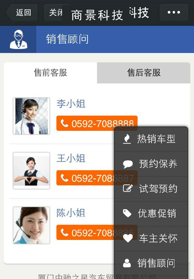 微汽車有汽車銷售管理、預(yù)約保養(yǎng)、預(yù)約試駕、保險計算、車貸計算、車型比較、違章查詢、360度全景看車、車主關(guān)懷等功能,整個過程非常便捷,省時省力,快速便捷的實現(xiàn)了商家的銷售管理與預(yù)約過程,同時也實現(xiàn)了客戶無需進入4s店就能進行預(yù)約保養(yǎng)和試駕的功能。 輸入"微汽車"體驗此活動