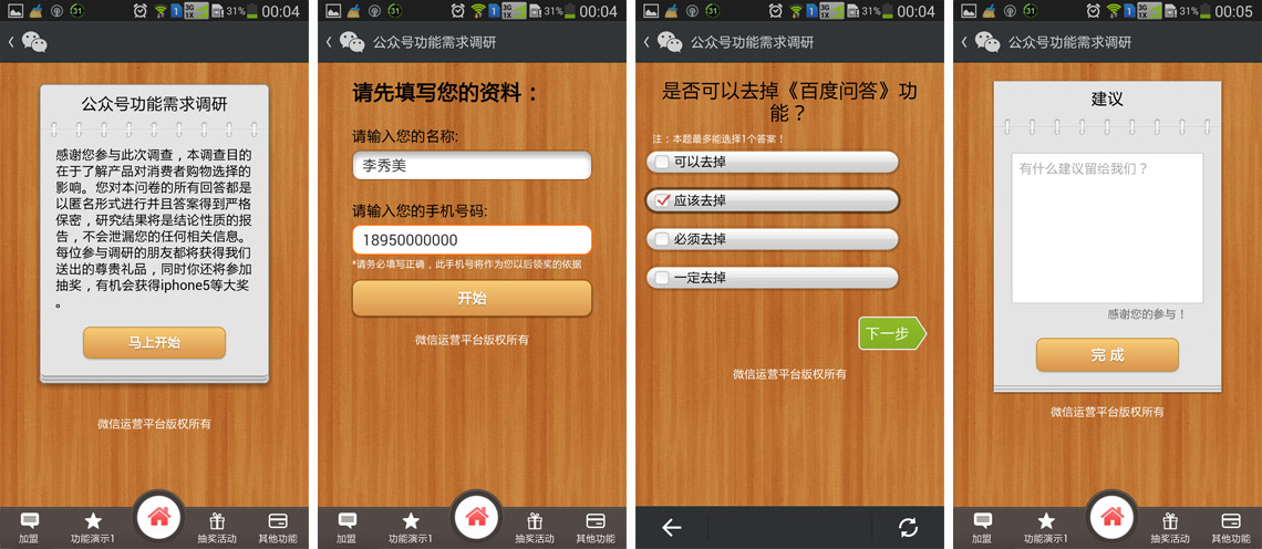 微信微調(diào)研功能可以針對數(shù)百個行業(yè)進行調(diào)研,是最流行、最便捷、最高效一種調(diào)研方式。通過問題的設(shè)定,你可以了解任何你想知道的問題,探尋客戶需求,挖掘潛在客戶,避免了傳統(tǒng)調(diào)研需要花費大量人力和財力的問題,配合微活動,更是讓你的營銷事倍功半。