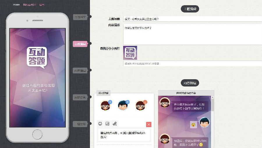 微信已經(jīng)成為我們生活中不能缺少的一部分,眾多功能被加入到了微信之中,你想知道朋友圈瘋傳的"老公,答對這5道題,今晚不用洗衣服,還有驚喜回報(bào)哦!"是怎么做出來的嗎?現(xiàn)在你不用羨慕別人了,創(chuàng)建有趣的互動答題,就從這里開始。