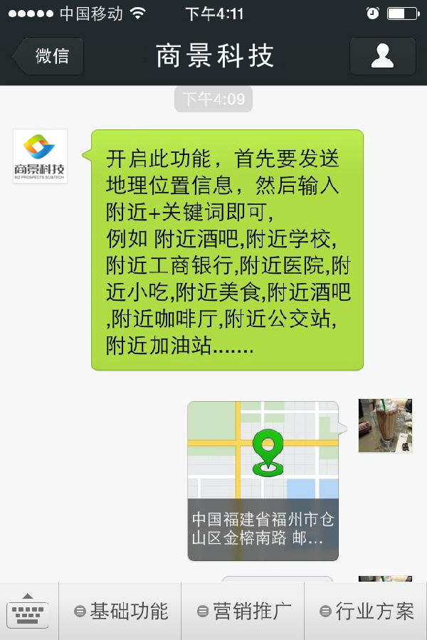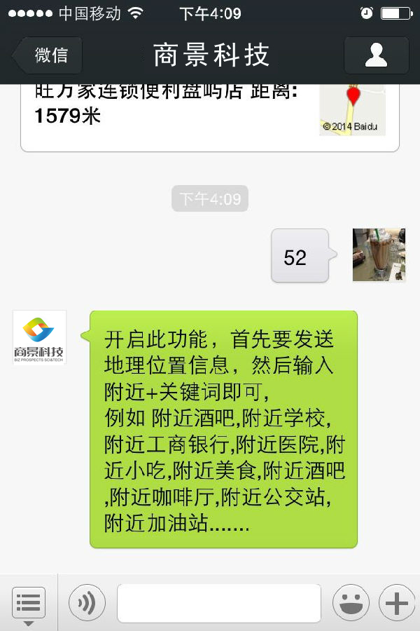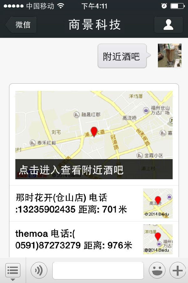 開(kāi)啟此功能,首先要發(fā)送地理位置信息,然后輸入附近+關(guān)鍵詞即可, 例如 附近酒吧,附近學(xué)校,附近工商銀行,附近醫(yī)院,附近小吃,附近美食,附近酒吧,附近咖啡廳,附近公交站,附近加油站.......