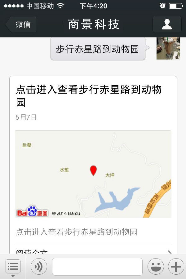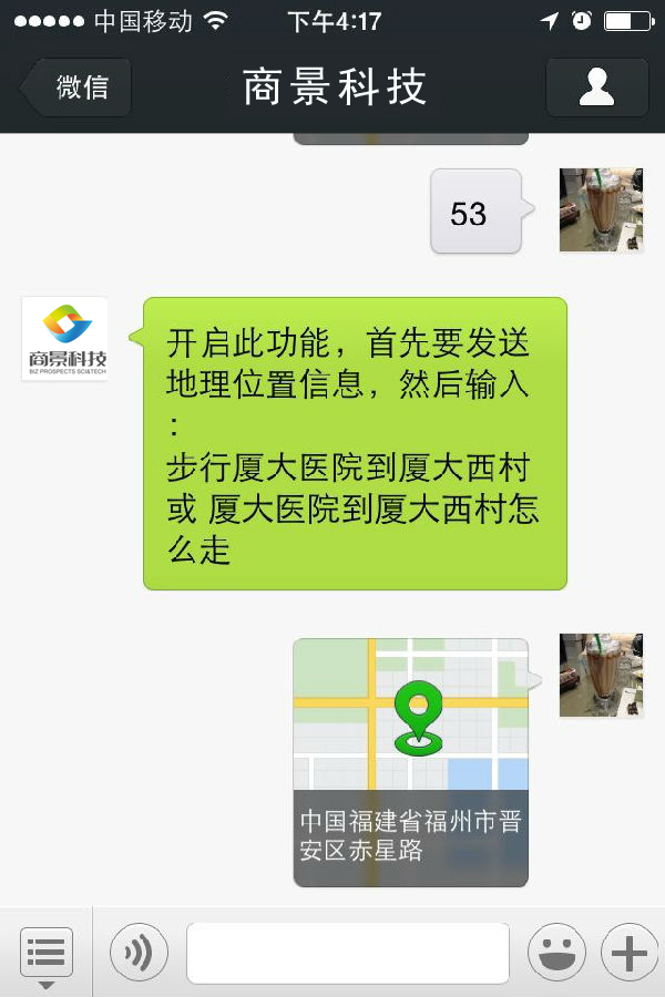 開(kāi)啟此功能,首先要發(fā)送地理位置信息,然后輸入: 步行廈大醫(yī)院到廈大西村 或 廈大醫(yī)院到廈大西村怎么走