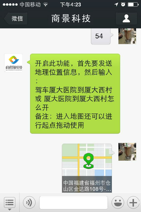 開啟此功能,首先要發(fā)送地理位置信息,然后輸入: 駕車廈大醫(yī)院到廈大西村 或 廈大醫(yī)院到廈大西村怎么開 備注:進(jìn)入地圖還可以進(jìn)行起點(diǎn)拖動(dòng)使用